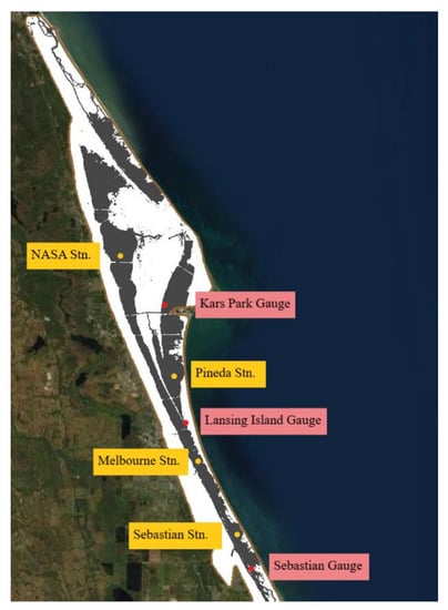 Water elevations averaged across all sets of estuarine stage forecast models were evaluated with data from in-situ measurements from Onset Hobo U20–001–01 pressure sensors []. Hobo sensors were deployed at the indicated gauge locations, Figure 8, for cycles lasting 1–3 months. The instruments were deployed by mounting them at the base of pilings under approved fishing and boat piers. While deployed, the sensors recorded temperature, water pressure, barometric pressure, and computed water levels in 5-min intervals.