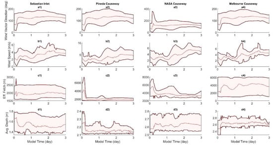 The rise in wind speeds across all ensemble members coincided with increases in wave height and period, Figure 13 and Figure 14. As the ensemble had a narrower field of wind speeds near Sebastian Inlet, Figure 9(b1), the ranges of model solutions for wave heights and periods were more dense, Figure 13a and Figure 14a. Ensemble forecasts encompassed a diverse range of effective fetch lengths, given wind directions of respective members, but the longest fetches after the 1-day mark were near Melbourne Causeway, Figure 9(c4). Waves from south-southeast winds were allowed to propagate unobstructed for over 12 km in this region of the Indian River Lagoon, resulting in larger wave heights and periods, Figure 13 and Figure 14. The Sebastian Inlet and Pineda Causeway areas, Figure 9(c1,c2), had shorter fetches, and, consequently, smaller wave heights and periods.