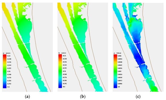 Contours were centered at −0.36 m due to model geoid offset, Figure 10a,b. For the chosen input conditions, water level was nearly identical. At the 60-h timestep of the model, Figure 10, the ADCparam, Figure 10a, and ADCIRC + SWAN, Figure 10b, solutions differed by less than 1%, Figure 10c. The average water level bias, Equation (10), across all nodes was −0.26 mm. Given the moderate wind field, minimal variations were expected.