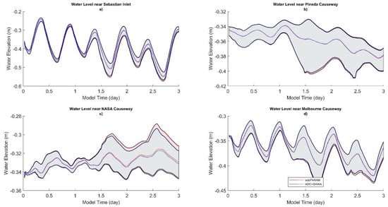 In areas nearest the inlet, where tidal influence was greatest, the elevation differences between the individual ensemble solutions were negligible, Figure 11a. The Sebastian Inlet station had the greatest error of the four nodes, with an average bias of 1.7 mm and NMAE of 0.42%. Larger deviations between model systems were most pronounced at locations where the tidal amplitude was small, as in Figure 11c. Set up and set down from winds also became more noticeable with less tidal influence, Figure 11b–d.
