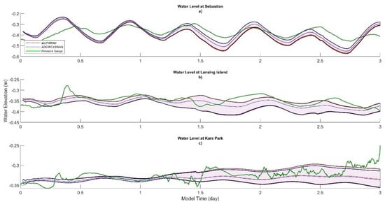 Time series plots of ADCparam and ADCIRC + SWAN ensemble range for water elevation and 50-min moving average of in-situ data (meters) with geoid offset near (a) Sebastian, (b) Lansing Island, and (c) Kars Park. Pressure sensor station locations are specified in Figure 8. Dotted lines represent the average solution across the full ensemble, while upper and lower bounds of shaded areas represent the maximum and minimum values of the whole ensemble.