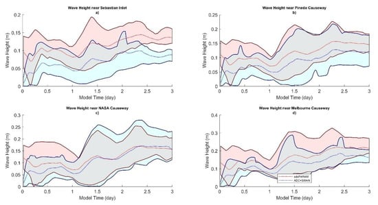 Due to the fact that the SWAN solution is time dependent, there was a contrasting spin up and slight phase lag in the SWAN solutions, Figure 13, compared to the PARAM subroutine. These differences were expected, and the overall offset in amplitude was marginal. The ADCIRC + SWAN model was given ample time to spin up before winds increased in magnitude at the 24-h mark. In the Northern area of the domain, Figure 13b,c, the ADCIRC + SWAN solution generally predicted more extreme maximum and minimum wave heights than ADCparam, although both produced a broad ensemble spread. The mean solutions were most in agreement north of NASA causeway, Figure 13c, with only 4.75% NMAE. In most cases, the ADCparam ensemble was overpredicting wave heights compared to SWAN, as expected, Figure 13a,d. In focal areas where waves developed over a long fetch, SWAN wave heights began to eclipse PARAM wave heights.