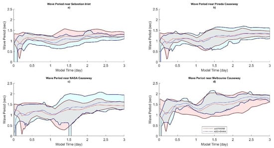 Time series plots of ADCparam and ADCIRC + SWAN ensemble ranges for wave period (seconds) near (a) Sebastian Inlet, (b) Pineda Causeway, (c) NASA Causeway, and (d) Melbourne Causeway. Each of these locations was selected based on location in the domain and associated fetch (station coordinates specified in Figure 8). Dotted lines represent the average solution across the full ensemble, while upper and lower bounds of shaded areas represent the maximum and minimum values of the whole ensemble.