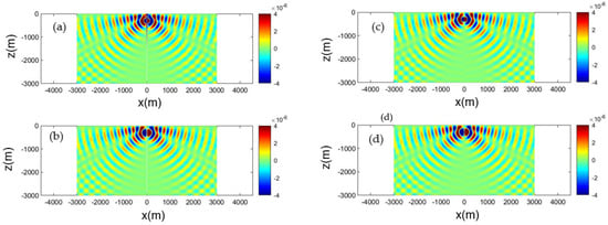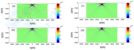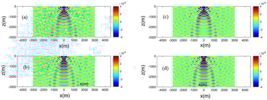 Calculated acoustic field corresponding to the horizontal dipole source, Equation (23). Source frequency 5 Hz, at submergence depth z0 = −300 m, in an isovelocity c = 1500 m/s ocean acoustic waveguide of depth h = 3000 m. Left column result obtained by the normal mode series, keeping 40 terms: (a) real part, (b) imaginary part. Right column: field obtained from the mirror series using six terms: (c) real part, (d) imaginary part.