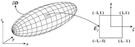 The integrals in Equations (34)–(36) are calculated numerically using the Boundary Element Method (BEM). According to BEM, the surface of the boundary is discretized into a number of four-node quadrilaterals :
