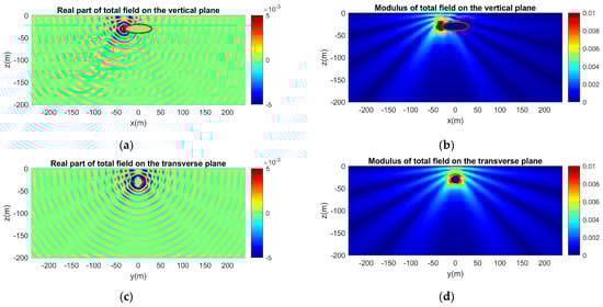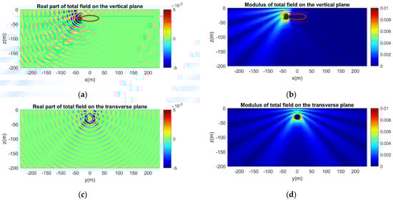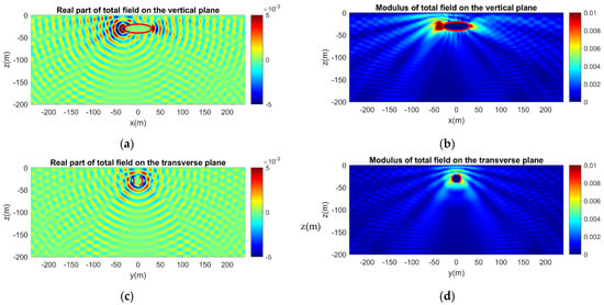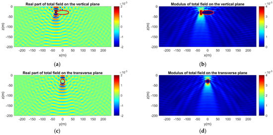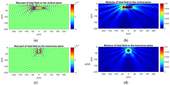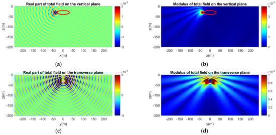 Same as in Figure 14, but for a vertical dipole source. The axis of the dipole is parallel to the z-axis. (a) Real part and (b) modulus of the acoustic field on the vertical plane. (c) Real part and (d) modulus of the acoustic field on the transverse plane.