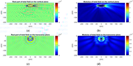 Same as Figure 14, but for a horizontal dipole source. The axis of the dipole is parallel to the major axis of the ellipsoid (x-axis). (a) Real part and (b) modulus of the acoustic field on the vertical plane. (c) Real part and (d) modulus of the acoustic field on the transverse plane.