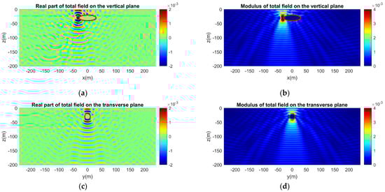 Calculated acoustic field in the semi-infinite ocean waveguide considering scattering of a monopole source field by an acoustically soft ellipsoid. (a) Real part and (b) modulus of the acoustic field on the vertical plane. (c) Real part and (d) modulus of the acoustic field on the transverse plane.