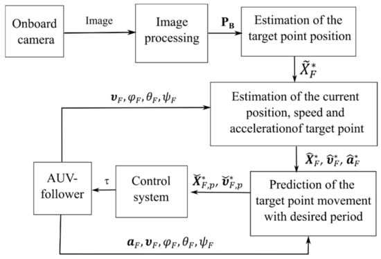 To solve this problem, we propose a control system, the diagram of which is shown in Figure 2. From this diagram, the formation of the control signal of the AUV-follower includes several steps.