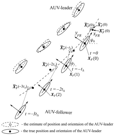As the vectors are calculated by taking into account the corresponding positions of the AUV-follower, the sequence will depend not only on the movement of the AUV-leader, but also on the follower’s own movements relative to the leader. This complicates the prediction of the movement of points and requires consideration of the previous movement of the follower. The positions of the points should be recalculated relative to the current position and orientations of the BCS of the follower to facilitate the solution to this problem. This allows the separation of the movements of the points , determined by the movement of the AUV-leader and the movements of the AUV-followers themselves. To do this, it is necessary to consider the speed and orientation of the followers at the appropriate time moments.