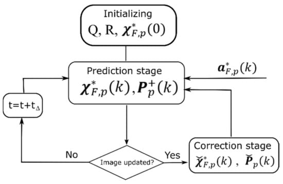 However, as the update of the vector , as a rule, occurs with a low frequency, it is necessary to form a control signal with an increased frequency at intervals between the updates of the data coming from the video cameras to provide the required precision of the control. To do this, the changes of should be predicted using information about the speeds and accelerations of these changes. However, it is not possible to predict changes in the vectors precisely enough, considering the significant errors in calculating the pixel coordinates of the light beacons and the inaccuracies in determining the parameters of the onboard video cameras. This leads to a reduction in the control precision of the AUV-follower. To eliminate this drawback, the use of the following approach for the improvement of the estimations of vector and its speeds and accelerations is proposed (see Figure 3).