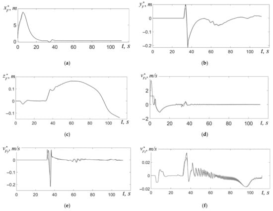 Although the updating period of the data about the position and orientation of the AUV-leader is 0.1 s, the control signals (due to the use of a system with a sliding controller) are updated 100 times faster. Thus, the control system (29), (30), and (34) provides the required accuracy of the movement of the AUV-follower. At the same time, at the initial stage of movement (from 0 c to 32 s), the main control signal is formed by the xF coordinate (see Figure 7a) to work out in a sliding mode a large initial error between the follower and the target point. Additionally, at the moment of 32 s, the resulting large errors are also successfully worked out by the system in a sliding mode when the transition from the linear to the spatial trajectory has happened. However, in other cases, a sliding controller begins to work only when the nonlinear regulator cannot accurately compensate for the interactions between the degrees of freedom of the AUV-follower.