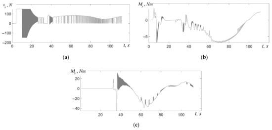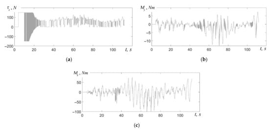 It should be noted that there is a discontinuous component with a sufficiently large amplitude in the control signals (Figure 7a,c). Currently, there are many methods for suppressing chattering, but for this study it was important to show that a sliding mode occurs in the control system, and the proposed prediction algorithm allows the ensuring of the operability of such robust control systems.