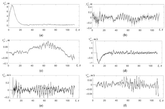 The results of the first study are shown in Figure 6. In this figure, the gray curves show changes in the coordinates and speeds of the target point moving along the program trajectory of the follower (gray curve in Figure 5), in the CS. The black curves show the estimates of these coordinates and velocities in this CS, calculated using Expressions (18), (22)–(25).