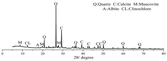 X-ray diffraction (XRD) tests were conducted to determine the mineral composition of the soil samples. These tests were conducted with a Shimadzu XD-D1 X-ray diffractometer. “MDI jade 9.0” software was used to carry out the qualitative analysis. X-ray diffraction patterns were obtained using a continuous-scanning-mode X-ray tube with a scanning range from 2° to 32° (2θ) and a scanning rate of 4° per minute. The diffraction data on crystal plane spacing and diffraction intensity were obtained through sorting and compared with the diffraction data of standard minerals for mineral identification.