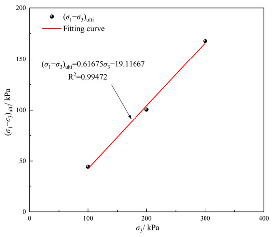 When the initial tangent modulus = 0, this can be inferred from Equation (3), = 0. Thus, according to the relevant parameters of Table 4, the relationship between the asymptotic value of the principal stress difference and the confining pressure under different confining pressures is shown in Figure 11. The relationship curve in Figure 11 can be fitted with a linear equation: