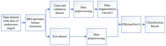In this paper, the original echoes are processed through Mel feature extraction. Then the Mel-spectrograms with accurate labels are delivered into the generating adversarial network (SGAN). Expanded data and raw data constitute the enhanced dataset. Finally, the CNN model (EfficientNet-S) can effectively classify the underwater targets with the enhanced dataset. Figure 1 shows the structure of the classification system.