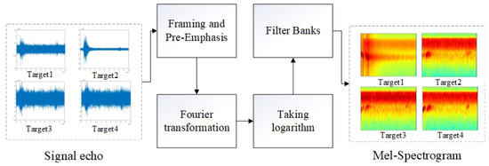 The flow block diagram of Mel feature extraction for the four types of simulated target echoes is shown in Figure 2. Firstly, the purpose of framing and pre-emphasis is to compensate for the loss of high-frequency components and boost the high-frequency components; then the FFT transformation is performed on each frame signal; finally the Mel-Spectrogram is obtained after calculating Mel frequency and energy spectrum. The signal is filtered through a set of filters, and the Mel spectrum is obtained by calculating the logarithmic energy of each filter. The transformation equation from the frequency domain to the Mel domain is (1).