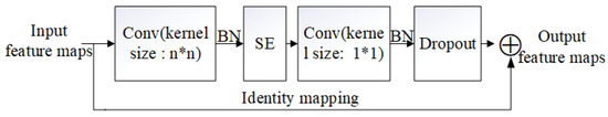 CNN is a kind of feed-forward neural network inspired by biological neural networks. Unlike traditional neural networks, CNN consists of convolutional layers, pooling layers, nonlinear activation functions, etc. These underlying layer structures in any combination can be superimposed to obtain deep networks, and deep CNNs can extract higher-order features ideal for solving image recognition problems. EfficientNets are a network series published by Google in May 2019 [17] that combine neural architecture search (NAS) with model scaling to jointly optimize the training speed and efficiency. However, the architecture of EfficientNet is too large compared with the dataset constructed in this paper. DCNN may be inadequately trained in case of FSL, and undergo a larger risk of overfitting. Inspired by the fuzed-MBconv module of EfficientNet-V2 [18], we construct the base convolution block following the below steps: (1) using a residual structure to add a constant mapping as a branch next to the regular main road in order to prevent the network from degenerating; (2) replacing the standard 3 × 3 convolution kernel with a combination of several sizes of convolution kernels; (3) replacing the conventional Relu activation function with a hard swish activation function to reduce the number of parameters and computational consumption of the model; (4) regularizing with BN after each convolution operation; (5) adaptively weighting the features in the channel dimension by using a self-attentive mechanism to improve the feature representation; and (6) using a dropout strategy to alleviate model overfitting. The structure of the base convolutional block is shown in Figure 3. Based on the idea of inverted bottleneck [19], we have developed the baseline model by stacking the base convolution block. A baseline is used as a benchmark to compare with the optimization model. Its structure is shown in Table 1.