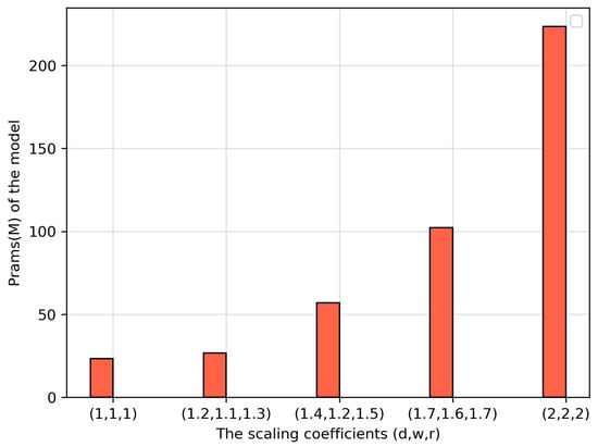 Further research found that increasing the width, height, channels or layers can improve the performance of DCNN. As the idea of model scaling gradually spreads to the design of new network structures, research works have shown that (1) the width–height scaling makes the number of parameters rise exponentially; (2) channel scaling tends to lose deep-level features; and (3) depth scaling tends to produce gradient disappearance or explosion. In a word, the expansion of a single dimension tends to encounter bottleneck. By conducting extensive NAS work, Ref. [17] systematically investigates model scaling. The authors empirically quantify the relationship among all the three dimensions of width, depth and resolution. According to formulation (2), we use five sets of coefficients for a uniform extension of the three dimensions to maximize the recognition accuracy, where N is the network model; X is the input; i is the network stage; is the structure of a stage; , , and are the number of layers, width, height, and channels of a stage of the baseline model; and d, w and r are a set of coefficients for scaling network depth, channels, and resolution.