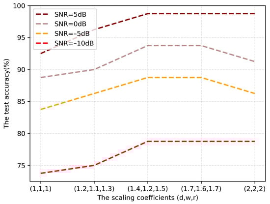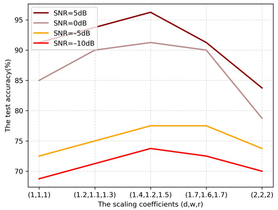 The training setting of the used network is a batch size of 16; the optimizer selects the stochastic gradient descent (SGD) with the strategy of decaying cosine learning rate = 0.01. The training process is carried out for 50 epochs based on our dataset. Figure 4 shows the relationship between scaling coefficients and model parameter quantity based on the Mel-spectrogram dataset. Figure 5 shows the result of scaling the model under different SNRs. The results show that when the composite expansion parameters are set to = (1.4, 1.2, 1.5), the model achieves the highest test set accuracy under different SNRs. We propose the optimal classification network model (Efficientnet-S) through this set of composite expansion parameters based on the baseline model. The structure of Efficientnet-S is shown in Table 1. Notably, EfficientNet-S model reaches above 95% accuracy with 50 epochs under SNR = 10 dB (Table 2), which achieves better accuracy than baseline model under all SNRs. It is noticeable that, as is shown in Figure 4, the model parameters will multiply as the scaling coefficients increase, but the recognition accuracy does not increase when the scaling coefficients continue to increase on the basis of Efficientnet-S (Figure 5). We speculate that this might be due to the FSL situation and high inter-category similarity of our dataset. In the circumstance of an insufficient dataset, the results of feature extraction and feature selection will differ greatly from the essential features of the target, leading to problems, such as low recognition accuracy and large bias of model parameter estimation. How to achieve the recognition and classification of underwater targets with small samples is the current problem that needs to be solved.