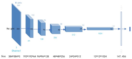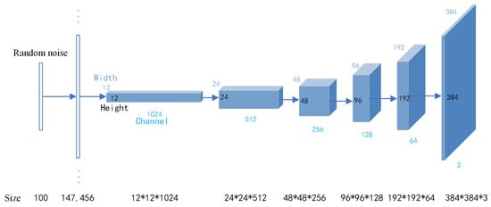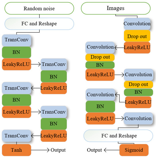 As shown in Figure 6, the generator of SGAN firstly generates 100-dimensional random noise. The data are enlarged through the fully connected layer, then reconstructed to transform the one-dimensional data into a three-dimensional matrix of 12 × 12 × 1024, doubling the feature map by the transposed convolution (TransConv) of five deconvolution layers. The final output is a feature map of 384 × 384 × 3. The discriminator performs the feature extraction by convolution operation (Conv) on the 384 × 384 × 3 size feature map outputted by the generator. Finally, the recognition result is outputted by the fully connected layer as shown in Figure 7. A batch normalization layer (BN) and an activation function (LeakyReLU) are introduced into both the generator and the discriminator. They are used to normalize the feature values, accelerate the convergence and improve the learning ability. In addition, a dropout layer is added to the discriminator to suppress the overfitting phenomenon and improve the generalization ability of the model. The structure of SGAN is shown in Figure 8.