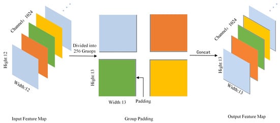 Compared with the conventional optical images, Mel-Spectrograms have more dense texture features and less distinct contour features, which requires less perceptual field in the deconvolution and convolution process. In consideration of this requirement, we propose to use 2×2 (C2) even-sized convolution kernels instead of the normal conventional 3×3 (C3) convolution kernels to achieve the purpose of parameter reduction. It is known from the properties of convolution that even-sized convolution kernels cause asymmetric receptive fields (RFs) that produce pixel shifts in the resulting feature maps, and such position shifts accumulate during multiple convolution superpositions and severely erode spatial information. Inspired by Ref. [22], we propose a group-symmetric padding (GP) method to divide the 1024-channel feature map into a uniform number of 256 groups in terms of channel order, and symmetrically pad the 4-channel feature map of each group. The specific steps are shown in Figure 9. The feature map size after padding is (channel, width, height) = (1024, 13, 13). Then the length and width of the matrix are expanded. Meanwhile, the dimension of the matrix is reduced by a deconvolution operation with an even-sized kernel ( size = 2 × 2, stride = 2). This whole process is called (C2-GP).