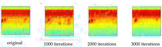 To evaluate the generative effect of SGAN with various convolutional kernel sizes, we use Mel-Spectrograms of four types of targets as input in turn. 5 spectrograms of the same targets are put into SGAN each time. We record the output images after every 100 iterations of the generator G. Figure 10 shows the generation results of SGAN-C2GP with 5 Mel-Spectrograms of target2 as input. The images generated after 1000, 2000, and 3000 iterations are compared with the original input images. It can be seen that as the iterations proceed, the number of noise points in generated images is significantly reduced. Both the contours and the detail textures are closer to the original images, which visually illustrates the effectiveness of the SGAN algorithm.