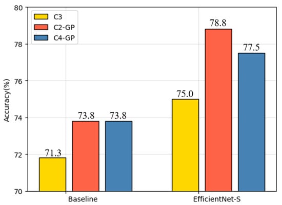 From the results in Figure 12, it can be seen that the even-sized convolutional kernels (C2, C4) achieve poorer performance than the odd convolutional kernel (C3). Both PSNR and SSIM of C2, C4 are significantly lower than C3. Notably, after introduced group padding (GP), the results of GAN with C2-GP and C4-GP both have a significant improvement. In particular, the PSNR value of C2-GP reaches 20.73, while the value of SSIM is 0.607. Those results verify that the effectiveness of the group padding method proposed in this paper. The computational complexity and the number of parameters are reduced due to the reduction of the convolutional kernel size. It can be seen that C2-GP takes less time than C3, and C4-GP takes less time than C5 for the same 3000 iterations. We obtain several generated images by SGAN with different padding methods and convolution kernels for 3000 iterations. The high-quality images are selected according to the criteria of SSIM, PSNR and intuitive sense. Finally, the number of training and validation datasets for each kind of targets is expanded from 95 to 300, while the test set remain constant. The results of the simulation experiments based on the expanded dataset are shown in Figure 13. The accuracy on the expanded dataset is larger than the accuracy on original dataset. To be precise, the baseline model achieves a 2.5% accuracy improvement while Efficientnet-S achieves a 3.8% improvement on the SGAN-C2GP expanded dataset. The results are consistent with the excellent performance of SGAN-C2GP shown in Figure 12. Moreover, comparing Figure 5 with Figure 11, it not only illustrates that the dataset expansion partly solves the decreasing accuracy due to scaling, but reflects the effectiveness of the SGAN as well.