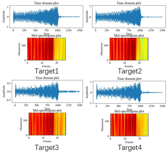 In order to simulate the real underwater target classification scene, it is necessary to build a simulation dataset that matches the real echo signals. The LFM signal is chosen as the transmitting signal, and the propagation medium is assumed uniform and homogeneous. The receiving array is a 6 × 6 equally spaced planar array with 0.026 m spacing. We change the conditions of reverberation and noise background to find the performance of this method at different SNRs. The SNRs of the signal are, respectively, 5 dB, 0 dB, −5 dB, and −10 dB. The left of Figure 2 shows the echoes of four types of targets at −10 dB. There are strong noise and reverberation interference with the signal. Therefore, it is hard to distinguish directly the four types of echoes only in the time domain. The spectrum is commonly chosen as one of effective feature for underwater acoustic target classification. Mel spectrum [16] has a visual representation of the spectral characteristics. It is basically the same as the human ear’s speech recognition. Actually, in the past, the traditional target recognition relied on the sonar of the soldier’s hearing.