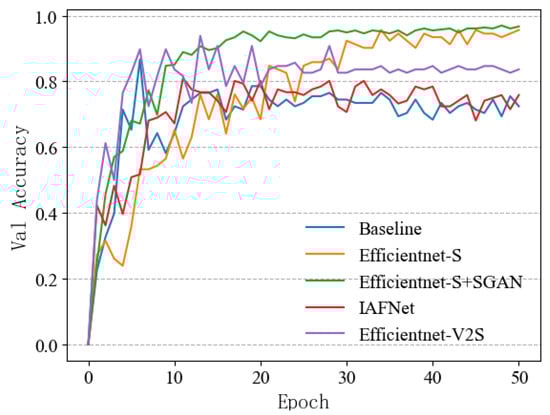 Comparing the results of Experiments 1, 2, and 3, it can be seen that the combination of Efficientnet-S and SGAN achieves 92.5% recognition accuracy in the test set. We observed that our algorithm outperformed the baseline with big margins on the experimental dataset. It also achieves an effective improvement of 2.5% compared with Efficientnet-S alone. These results suggest that the SGAN can achieve effectively regular augmentation for the Mel-Spectrograms dataset. As shown in the green lines of Figure 16 and Figure 17, we notice that the case of the decrease in validation accuracy and the increase in validation loss no longer appear, and the training process is smoother. These results fully indicate that the overfitting problem is effectively suppressed after the data expansion by SGAN. Such a result illustrates that our algorithm can effectively solve the problem of an insufficient amount of underwater target data. Another important observation is that the continuous expansion of the data set can still reduce the overfitting to a certain extent, but it will also bring more time consumption. In contrast with Experiments 4 and 5, the result of Experiment 3 shows that the model of Efficientnet-S combined with SGAN achieved superior performance on the experimental dataset compared to the other existing algorithms. Due to the decreasing depth of the convolutional layer, the Efficientnet-S training time consumption is also significantly lower than Efficientnet-V2S. The IAFNet is a lightweight network. Although the training speed is fast, its test set accuracy is only 73.8%, which is much lower than our algorithm.