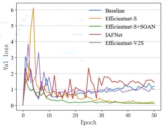 Based on the SGAN proposed in Section 2.3, we expanded dataset based on experimental echoes. The number of training datasets for each type of targets was expanded from 95 to 300 based on the screening of generated images by SSIM, PSNR and intuitive sense. The number of test dataset remained constant. The same training strategy and initial parameters as in the previous section were used to train in the experimental dataset after the SGAN expansion (Experiment 3). To compare with other current models, the IAFNet [14] and EfficientNet-V2S [18] network models were also experimented on the original dataset (Experiments 4 and 5). The results of each experiment are shown in Table 5. Figure 16 and Figure 17 show the graphs of validation accuracy and validation loss according to the different numbers of epochs.