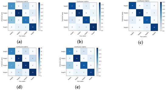The confusion matrices of different models. (a) Baseline. (b) EfficientNet-S. (c) EfficientNet-S+SGAN. (d) IAFNet. (e) EfficientNet-v2S.