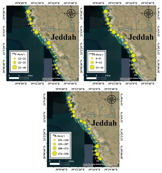 Al-Mur, B.A.; Gad, A. Radiation Hazard from Natural Radioactivity in the Marine Sediment of Jeddah Coast, Red Sea, Saudi Arabia. J. Mar. Sci. Eng. 2022, 10, 1145. https://doi.org/10.3390/jmse10081145
