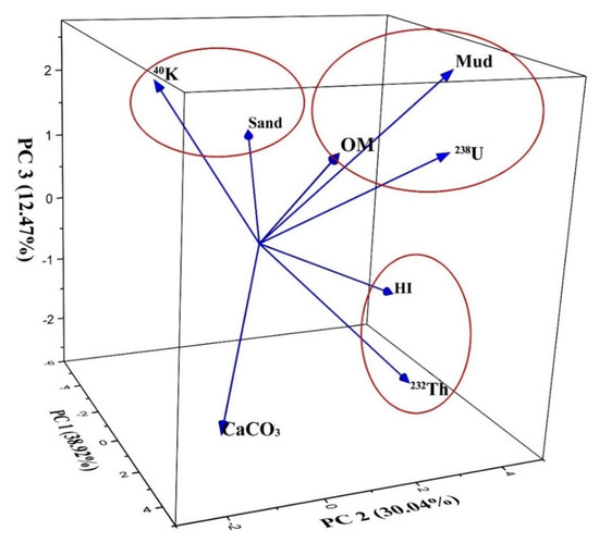 | Sample No. | CaCO3 % | OM % | Sand% (2.00–0.063 mm) | Mud% (<0.063 mm) | Heavy Minerals% | 238U (Bq kg−1) | 232Th (Bq kg−1) | 40K (Bq kg−1) |