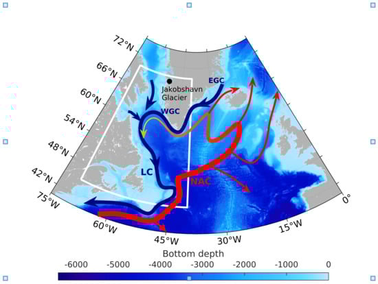 Map of the computational domain and circulation in the subpolar North Atlantic. The arrows show major currents in the subpolar gyre, including the North Atlantic Current (NAC), the Eastern Greenland Current (EGC), the Western Greenland Current (WGC), and the Labrador Current (LC).