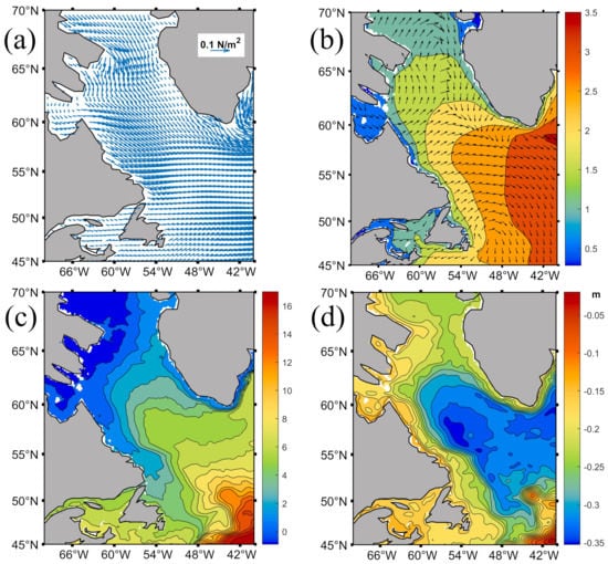 We present the results from a case study from the year 2008. Our computational domain includes the entire Labrador Sea and extends from N to N and from W to W (Figure 1). The forcing data (Figure 2) include ocean currents, wind velocity, and the characteristics of surface waves. The latter consist of the mean wave period T, mean wave direction , and the significant height of the combined waves and swells . The wind and surface wave characteristics were derived from the hourly ECMWF reanalysis (ERA5) [] with a spatial resolution of . ERA5 is the fifth-generation ECMWF reanalysis [], which has been extensively used in studies of the subpolar North Atlantic over the last few years [,]. The ERA5 surface atmospheric fields over the Labrador Sea were validated and compared with those obtained in other reanalyses in [].