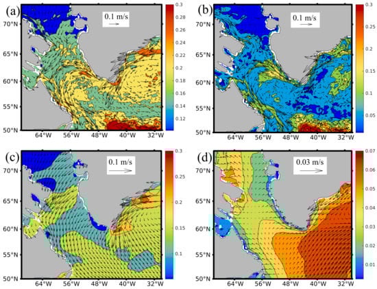 Figure 3 shows the annual mean surface velocity and its components, namely, the quasigeostrophic, Ekman, and Stokes velocities. Here, the term “quasigeostrophic” is used for the sum of the geostrophic, nonlinear, and time-tendency components of the velocity. The standard deviation of the velocity components is shown in color. The quasigeostrophic velocity (Figure 3b) has its highest magnitude in the East and West Greenland currents and in the Labrador Current. These boundary currents are steered by the bottom topography and are intensified over the continental slope. They are strengthened by winds in the fall and winter seasons and decrease in the summer. The quasigeostrophic currents in the southern part of the region are influenced by the North Atlantic Current (NAC). This current is subject to high mesoscale eddy variability (Figure 3b). The annual mean Ekman currents have predominantly southward to southwestward directions (Figure 3c). The variations of the Ekman transport are most significant along the west coast of Greenland. The Stokes velocity has the smallest contribution to the annual mean surface currents (Figure 3d). It has a larger magnitude in the southeastern part of the region.