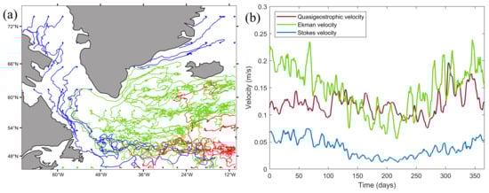 Surface float trajectories (a) and velocity components (b). The trajectories are colored according to the annual mean sea surface temperature at the point of release: C (red), C (green), and C (blue). The quasigeostrophic (red line), Ekman (green line), and Stokes (blue line) components of velocity are averaged over the entire ensemble of floats.