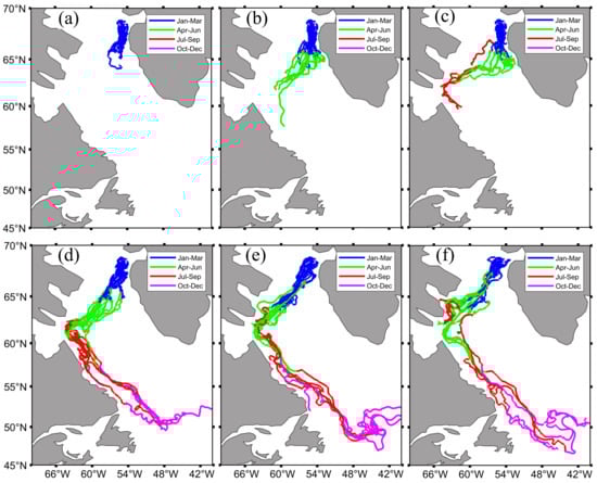 Trajectories of icebergs of different masses: categories 3 (a), 4 (b), 5 (c), 7 (d), 9 (e), and 10 (f) (Table 1).