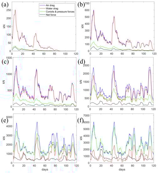 The magnitude of forces applied on icebergs of different masses during the first 120 days of their journey: categories 3 (a), 4 (b), 5 (c), 7 (d), 9 (e), and 10 (f) (Table 1).