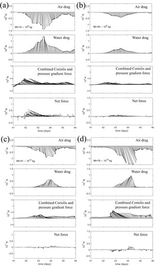 Consider the evolution of forces during the single storm passing over the western North Atlantic on days 41–46. The vector diagrams in Figure 7 show the time series of forces for four icebergs of different masses. For the smaller icebergs (see Figure 7a,b), the air and water drag forces are in opposite directions but of the same amplitude; they are in almost perfect balance. The combined Coriolis and pressure gradient force is much smaller; together with the residual of the balanced stronger drag forces, it results in the total net force.