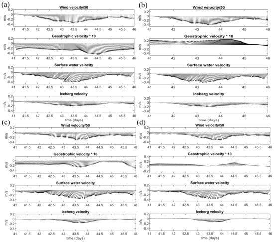 Vector diagrams of air, water, and iceberg velocity for icebergs of different masses during a storm event: categories 4 (a), 5 (b), 9 (c), and 10 (d) (Table 1).