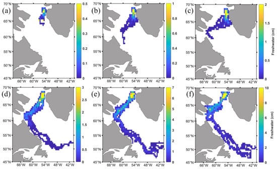 Icebergs melt during their journey, delivering cold freshwater to the environment. The amount of freshwater depends on how long an iceberg stays in a particular area, as well as on the control parameters in Equations (6)–(8). Perhaps the main parameter affecting the melting rate is the seawater temperature, . Figure 2c shows that seawater becomes warmer by approximately 2–3 C along a typical iceberg trajectory while following the boundary current from offshore of the Jakobshavn Glacier to the end of the Labrador coast. Beyond that, the seawater temperature rapidly increases in the eastern direction towards the warm waters of the NAC. Figure 9 shows the simulated amount of freshwater delivered by icebergs. This amount is averaged over an area of and is shown in cm. The pattern of melting is similar for all icebergs, although larger icebergs deliver more freshwater, as one might expect. The greatest amount of freshwater is deposited in the area west of Greenland, where icebergs spend more time. Similar melting patterns were reported in simulations by different authors [,].