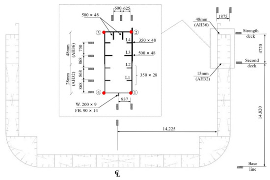 Figure 2 shows the midship section, with the torsion box detail, formed by two types of high-strength steel (206 GPa Young modulus and 0.3 Poisson’s ratio): 315 MPa yield strength steel (AH32) and 355 MPa yield strength steel (AH36), as shown in Table 3.