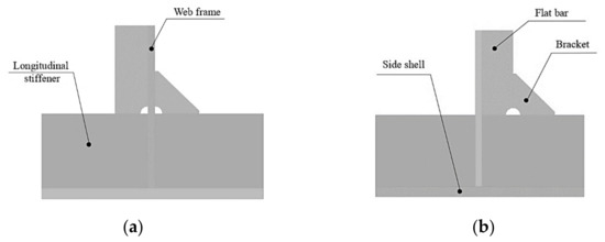Different configurations of the structural intersection referring to the four longi-web (longitudinal stiffener with transverse web frame) connections located on the side shell (L1, L2, L3, and L4) are studied as a function of the arrangement of stiffening elements (brackets and flat bars), located at the midpoint of the distance defining the spacing of primary transverse elements. The procedure is established by the following nomenclature and description of the structural details under study: Det1 is defined by one flat bar on one side, Det2 is characterized by a separate flat bar on one side, Det3 is defined by a separate flat bar and a standard bracket, Det4 is characterized by a separate flat bar and a well-rounded bracket with soft toes on each side, Det6 is defined by a flat bar and standard bracket on the same side, Det8 is characterized by a flat bar and a well-rounded bracket with soft toes on the same side, Det10 is determined by a flat bar and a standard bracket on one side and a standard bracket on the other side, and Det12 is defined by a flat bar and a standard bracket on one side and a well-rounded bracket with soft toes on the other side. The scantling of the bracket is proportional to the scantling of the flat bar. Figure 3 shows the side view of two different structure details.