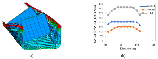 The second stage establishes the relationship of influence of the dimensions of the torsion box specified in each of the plates (elementary plate panel, EPP), which is the unstiffened part of the rectangular plating between ordinary stiffeners and/or primary supporting members that constitute the perimeter of the torsion box. The determination of shear, warping, and buckling stresses obtained through the software of the classification society Bureau Veritas Mars2000® [33] following the same procedure developed by Im et al. [34] by means of a submodel consisting of three cargo holds with a length within 0.4 L amidships (Figure 6) under the same boundary conditions as Tanny et al. [35]. Ship behavior is always in hogging condition and the total contribution due to still water bending moment (SWBM) and vertical wave bending moment (VWBM) described in Section 2, is shown in Figure 6.