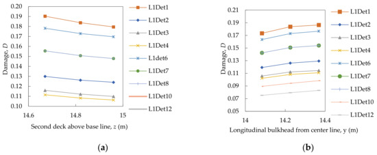 Evolution in the fatigue damage for longitudinal No. 1 (L1) of the different structural details. (a) Modification in the second deck height from base line, (b) modification in the longitudinal bulkhead distance from centerline.