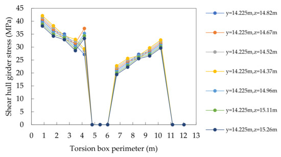Evolution of shear hull girder stresses along the perimeter of the torsion box.