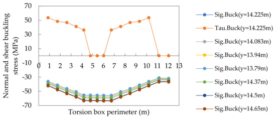 Figure 11 shows the evolution of the value of the elastic buckling stress (normal and shear) along each of the elementary plate panel (EPP), under the condition of simply supported on all four sides, that compose the perimeter of the torsion box for changes in the value of the width variable and an initial value of the height variable. Figure 12 depicts the same result under modification of height variable.